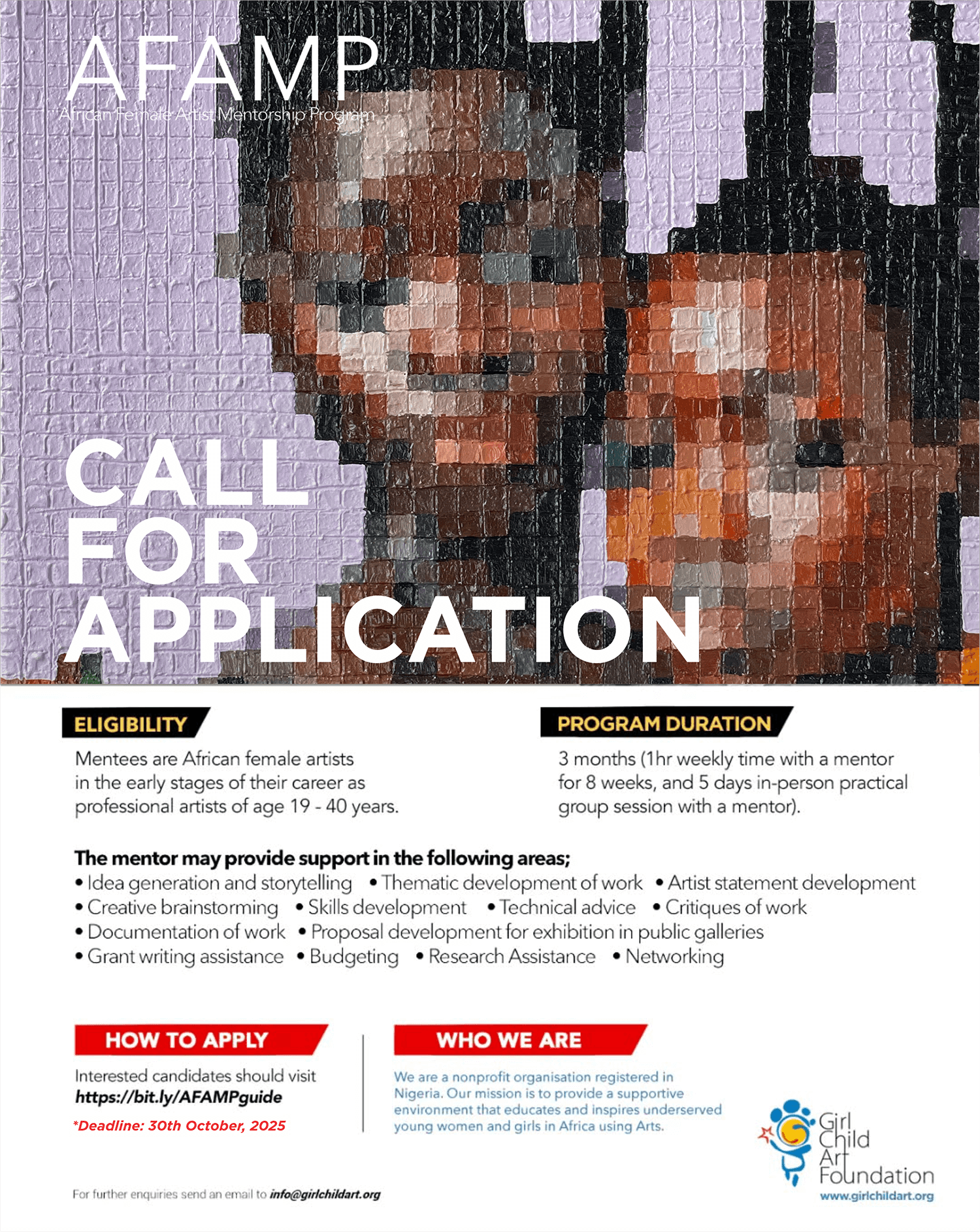 Email a copy of your Application Proposal by October 30, 2025, to: gcaf@girlchildart.org